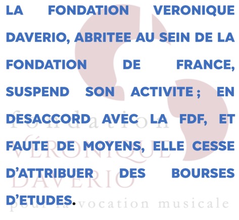 Suite à épuisement de la dotation, la Fondation Véronique Daverio, sous égide de la Fondation de France, suspend son activité plus tôt que prévu initialement. Elle ne décernera donc pas de Bourses d’Etudes au-delà de 2025…